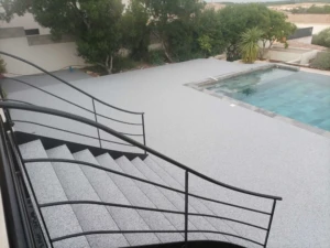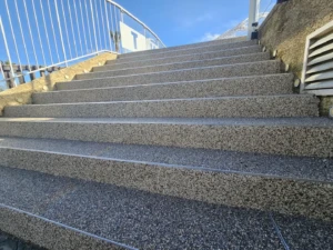 Mélange granulats + résine, réglage des pentes, profils de finition, talochage homogène des marches/contremarches.